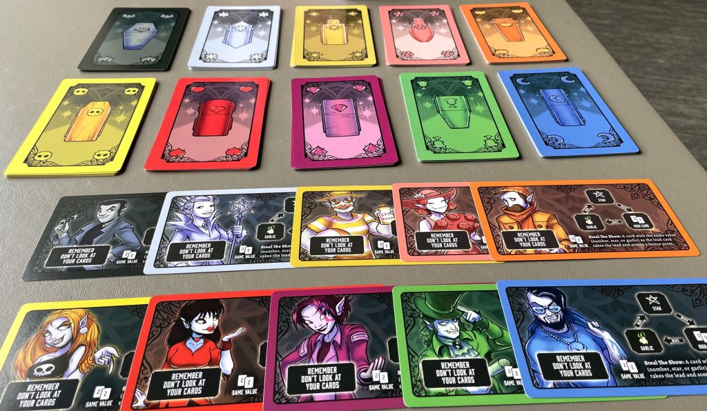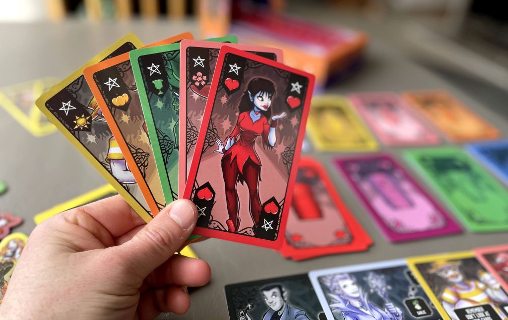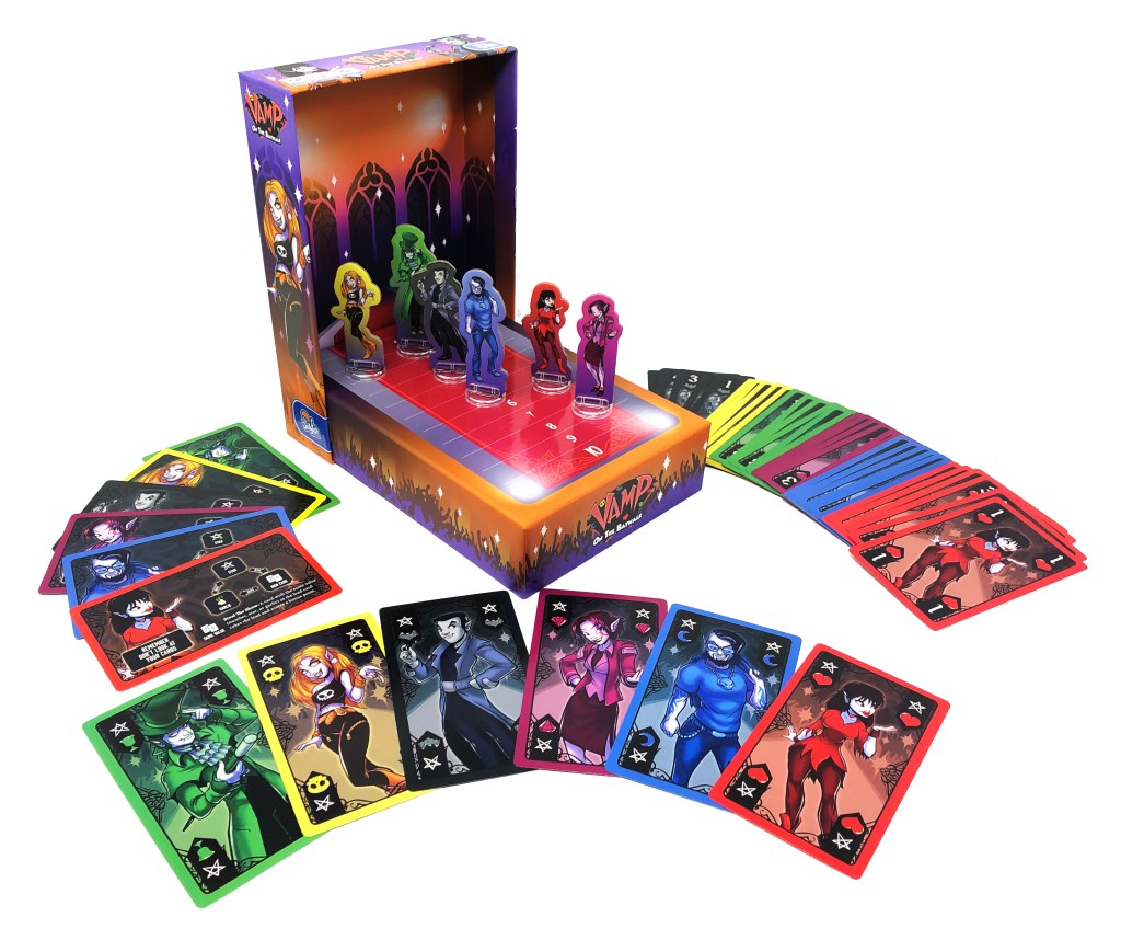 Vamp on the Batwalk, designed by Jon Simantov and published by Jellyfish Game Studios. is a light-yet-strategic card game for 2 to 6 players. It boasts bright colors, a unique theme, and a trick taking twist: you see only the suits of your own cards (on the back of each), but you have full view of your opponents’ hands.
