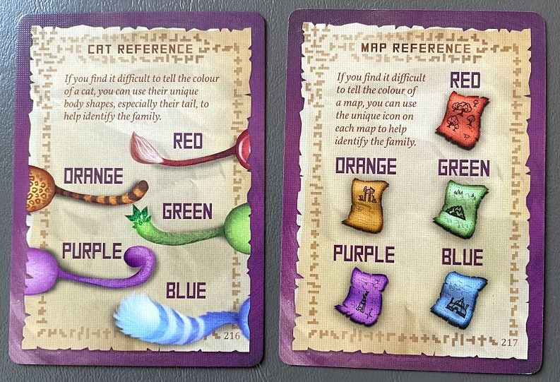 Accessibility features are included on player boards, too. The icons on treasure map spaces make it easy for colorblind players to distinguish red/green or purple/blue items at a glance.
