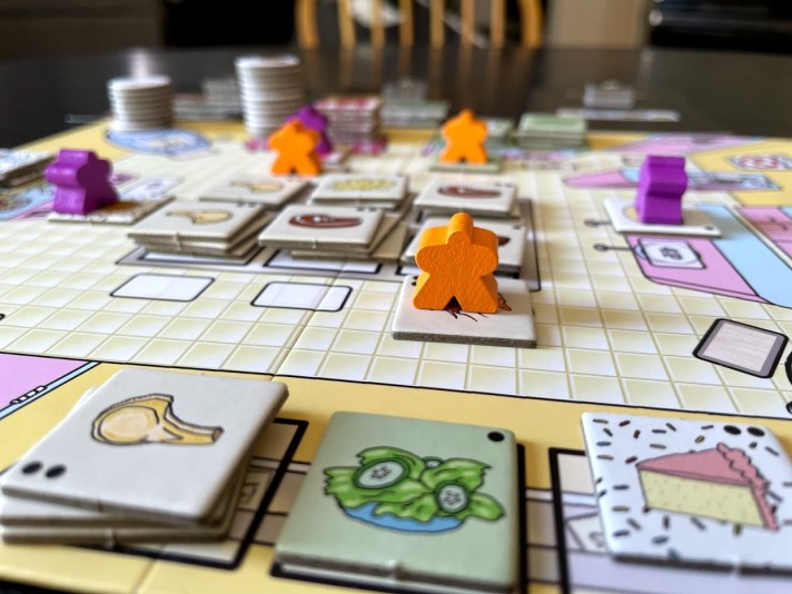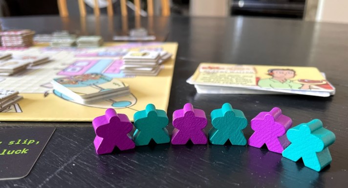I played a 2-player game for this review, so I selected two colors I could distinguish quite easily – I think they were yellow/orange and blue-ish. At lower player counts, meeple colors probably won’t be an issue, but if you’re playing with four I recommend a modification or swap-out using your own components.