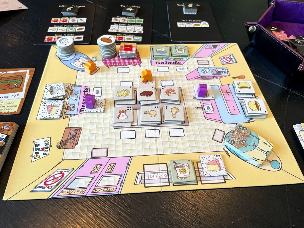 Underneath the theme, Scoffton is a basic worker placement game, with each player controlling three workers and a blocker. The Manager cards introduce a little chaos between worker placement and activation, and a couple fun elements (Lost and Found and a Claw Machine) add alternate scoring possibilities.