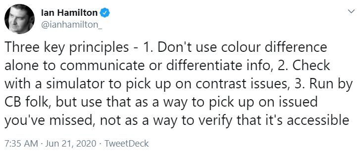 Ian Hamilton, an accessibility specialist in Bristol, England, identifies three key principles related to colorblindness in game design.