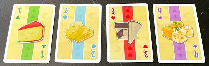 Each player’s goal in 1-2-3 Cheese! is to end each round with as few cards as possible in their stash (the area in front of them) and hands. To do this, they will build same-color runs and same-color number matches, placing those unwanted cards in front of their opponents.