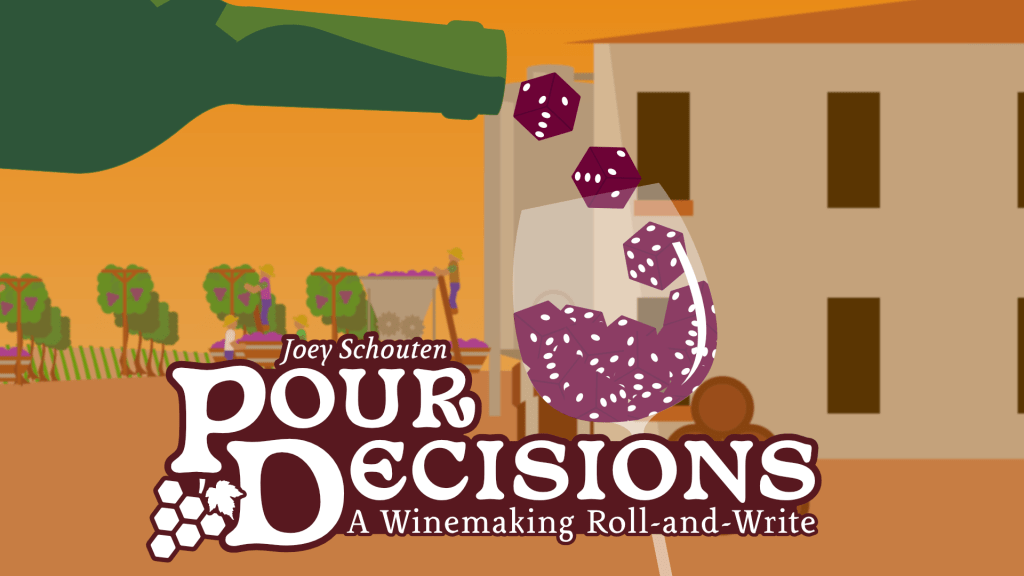 In Pour Decisions you are a dice-rolling vintner, conducting the various processes of wine production: growing, harvesting, crushing, fermenting, and pressing. Certain dice (grey, purple, and brown) can be used for only some of the processes, and white dice can be combined with the colored dice to support some spaces, similar to QWIXX.