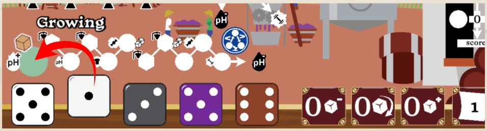 Each process has its own rules for dice placement. For example, while Harvesting each number placed must be a higher value than the one below it. Crushing requires particular numbers, and Growing has alternating requirements – the next number must be higher, then lower, then higher again.