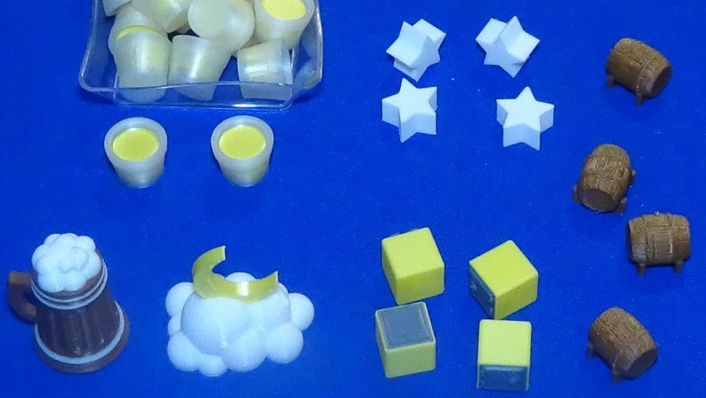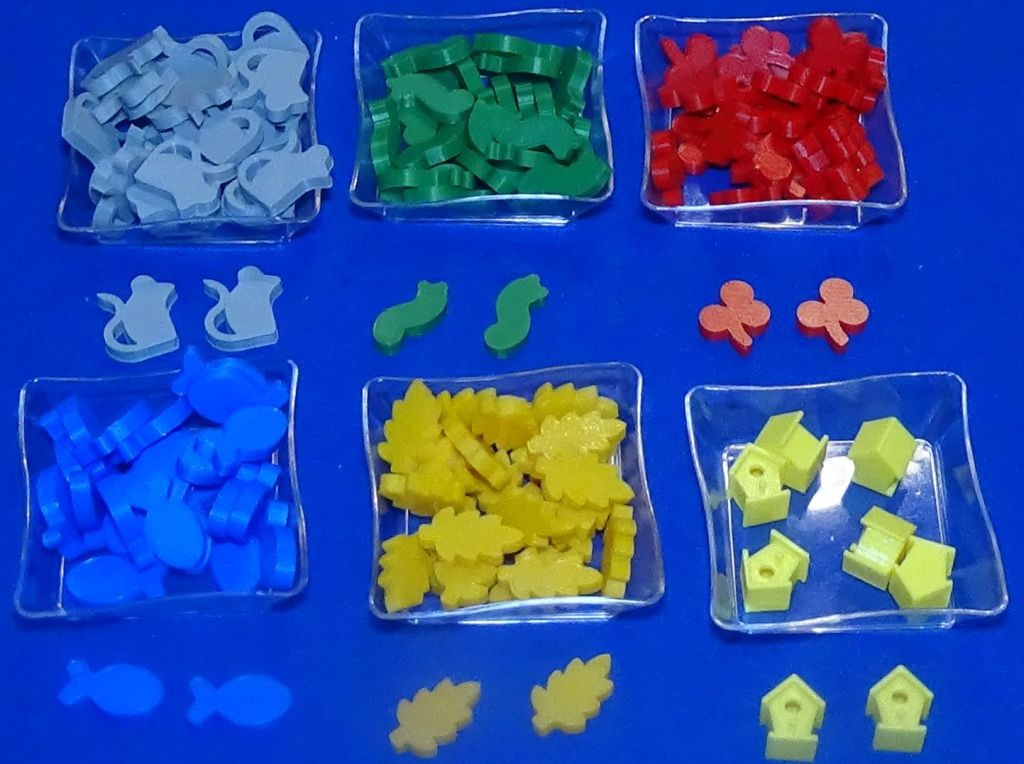 - Component shapes. Whether two-dimensional chits, wooden resources, or anything else, it is much more useful if they are distinct from one other. For example, Charterstone has shaped resources as well as some meeples that are unique. Sometimes we benefit from investing in upgraded components, like the available items for Wingspan or Taverns of Tiefenthal.