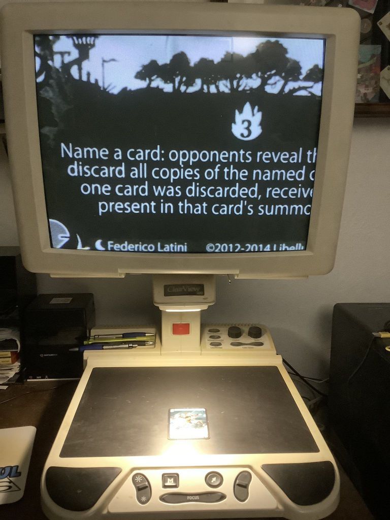 For all intents and purposes, my husband Will cannot see tabletop games. He plays almost completely in his head and what he can feel by touch. He has a closed-circuit TV (CCTV), which allows him to magnify cards, but text and symbology must be simple and distinct due to how bad his vision is.