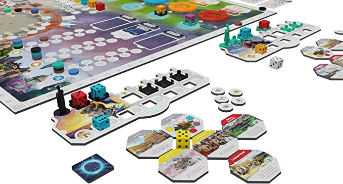 - Visit an encounter site with your workers to gain resources and additional citizen or speaker dice, advance on the zodiac temple tracks (and potentially gain zodiac cards), and advance and attack on the military track.