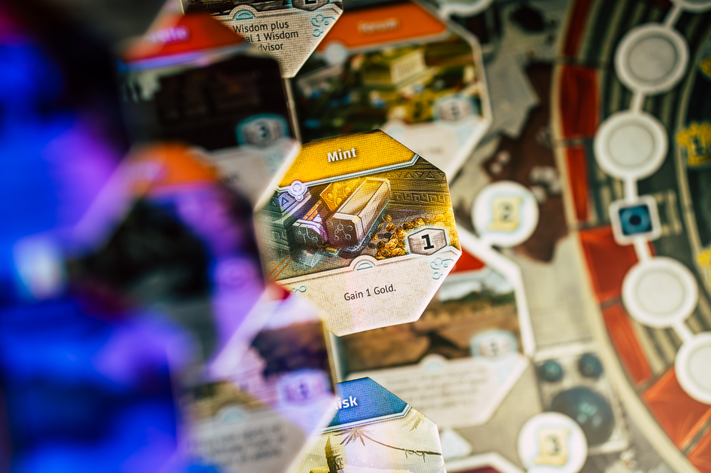 The temple area is divided into three temple-based tracks: sea, forest, and mountain. You score points only for your two least-valued temples, and once all the points have been summed, whoever has the most points wins.