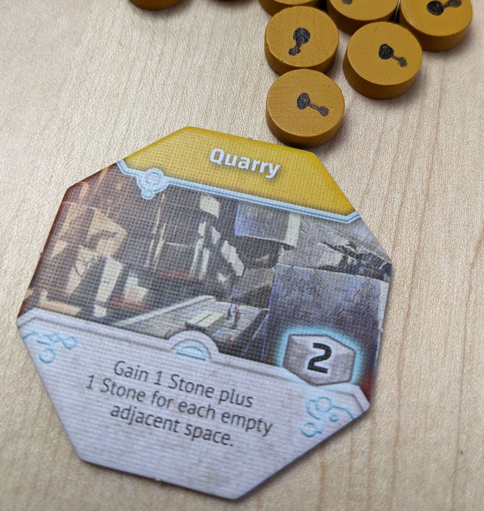 The main sources of my frustration in this game came from the yellow and orange colored discs (used to denote how many tower levels players have) and the associated dice. The strength dials, discs, dice, and tiles are all associated together, with each tile including a symbol to denote its building type.