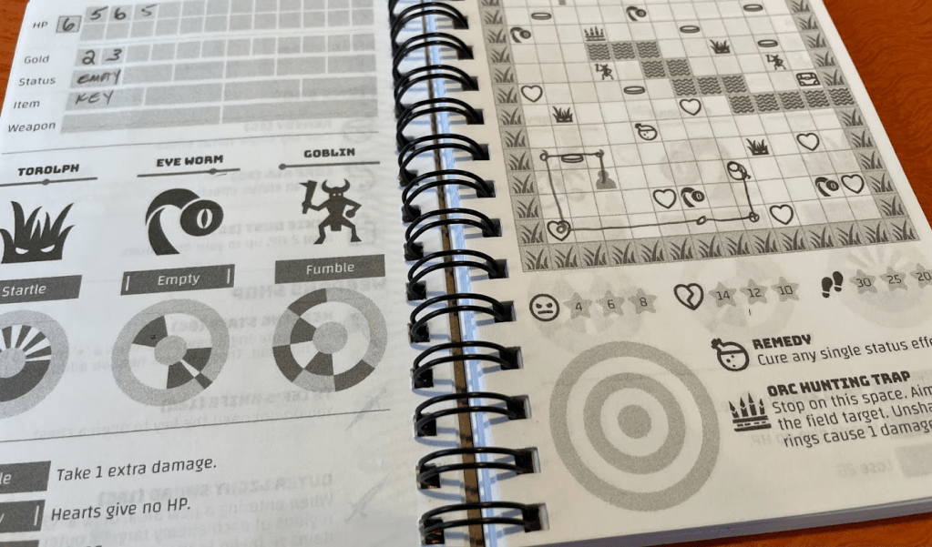 I am a fan of clever designs with minimal components (see my Button Shy Games reviews here, here, and here). What makes Pocket Book Adventures different than other games I’ve played is the aiming mechanism. Several times during a game I was asked to put my pencil on a starting point, then close my eyes or look away, then try to place my pencil in the center of the target.