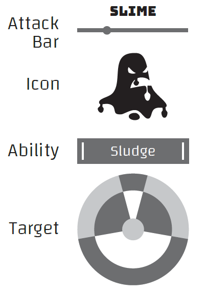 Aiming is used to determine the amount of treasure in a chest, in training exercises to earn bonuses, and to resolve monster encounters. The monster battles include not only a “closer to the center = less damage” element, but also status triggers. For example, the Slime monster can add Sludge to my character, reducing my maximum movement distance.