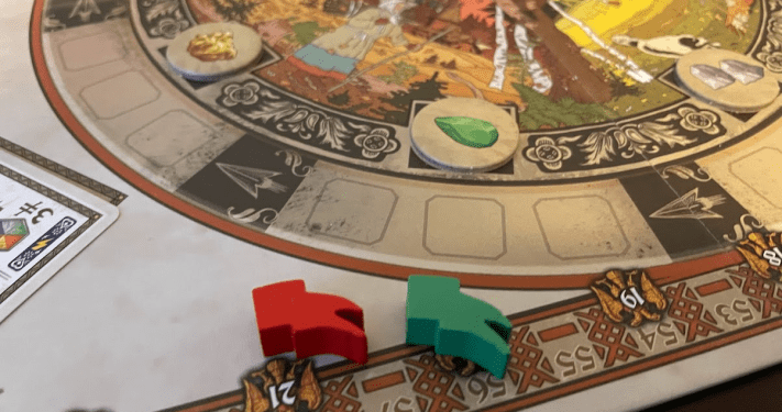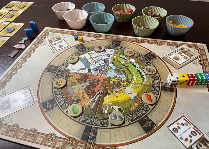 Gameplay includes gathering resources, satisfying requirements to build or ornament a section, and several other point-scoring opportunities. The primary resource-related actions occur on the central 8-space rondel, which also includes the ability to gain favor from guilds based on quadrant (season). Players choose one of five dice to move along the rondel based on what die face is showing.