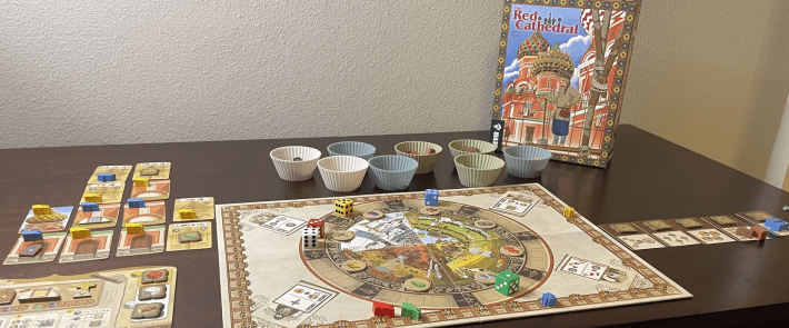 The Red Cathedral, designed by Israel Cendrero and Sheila Santos and published by Devir Games, is a classic Euro that puts 1 to 4 players in the role of construction teams building St. Basil’s cathedral in Moscow. One team will gain the most favor of the Tsar by building and ornamenting sections of the church.