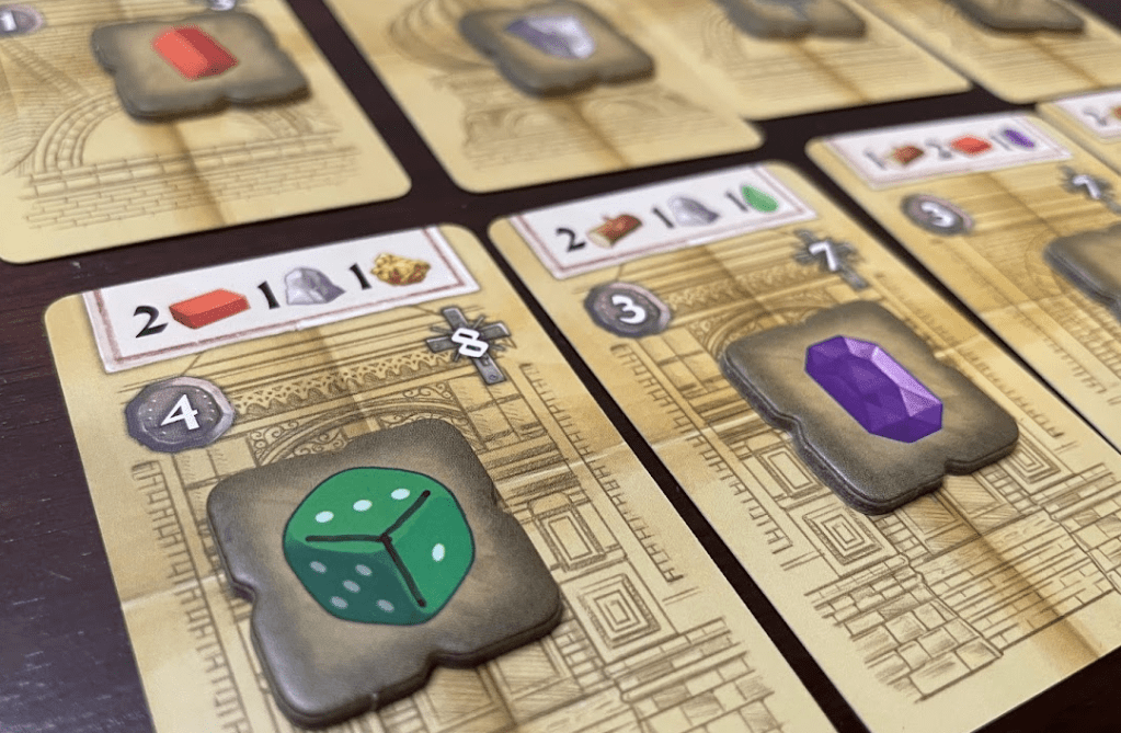 Colorblind Accessibility. In general, The Red Cathedral does a good job double-coding components. The primary building materials (stone, wood, brick, etc.) are different colors and shapes, making it easy to distinguish the components from one another. The four player colors (red, green, blue, yellow) and five dice (same colors, adding white) are in standard “Crayola 8” pantones, making most of them easy to distinguish. My only color confusion in the game related to the red/green dice and player pieces. I could tell the difference when they were placed next to each other, but not alone.