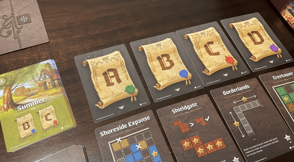 Cartographers includes several point-scoring “decrees,” two of which are active to score each season (round). Players flip cads to reveal the polyomino shape(s) and type(s) (Forest, Village, Farm, Water) they can choose to add to their map. Also in the deck are Ambush cards with monsters that can disrupt each player’s scoring strategy.