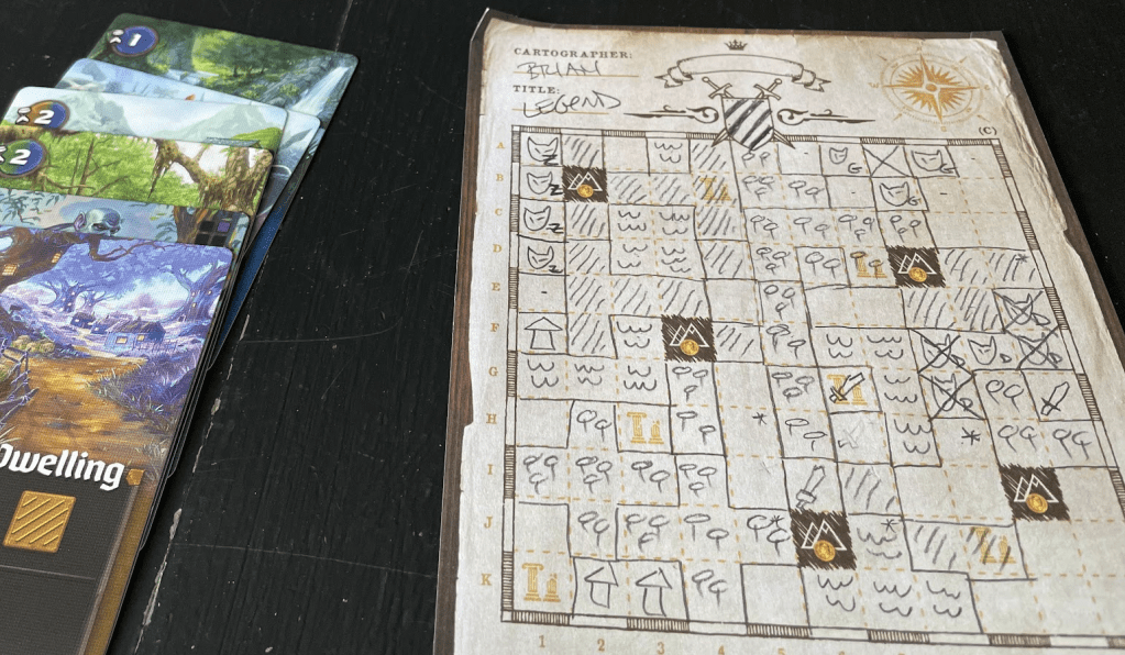 Solo Mode. Playing Cartographers solo changes one element and adds another. Ambush (monster) cards are semi-randomly added to the map (versus being added by opponents in multiplayer). At the end of the game a solo player adds up their score, then they subtract the “value” of each scoring card that is indicated at the bottom-right (similar to the Button Shy -Opolis series of games) to determine a solo score and an official title that can range from Oblivious Inkdrinker to Legendary Cartographer. I have proudly achieved each and every title available.