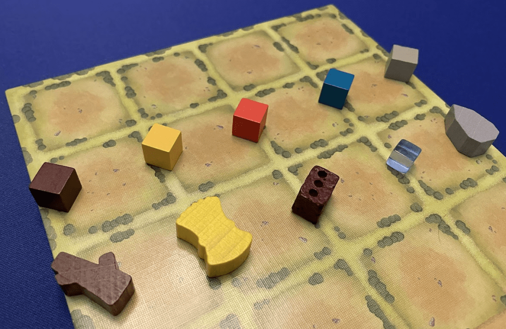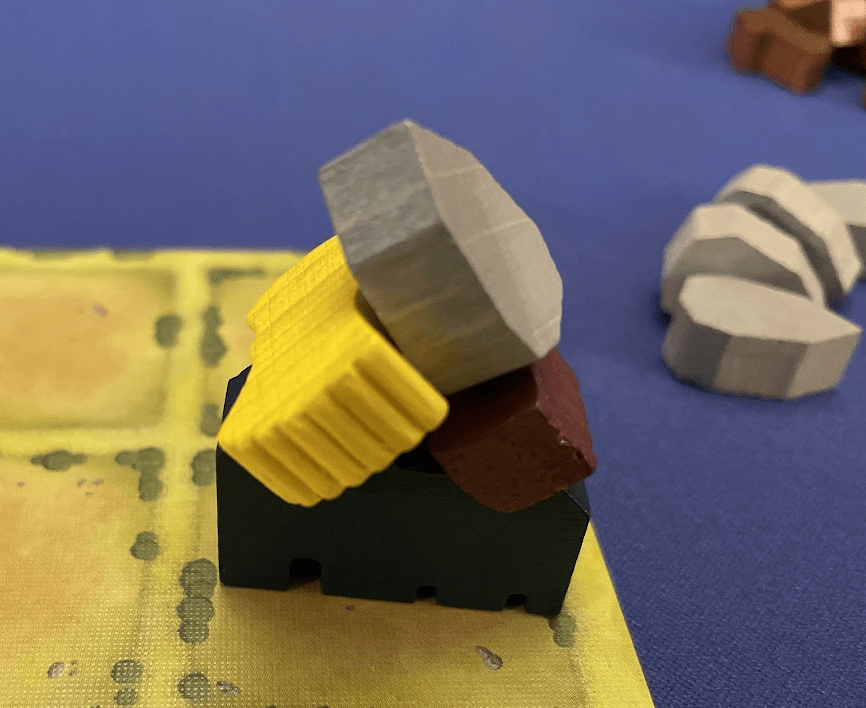 Component Sizes. Most new resource components I used are quite a bit bigger than the provided cubes. One ramification is that combining the resources to build a building didn’t feel quite the same, as these resource tokens are as big (or bigger) as some of the buildings. Stone, in particular, is larger than the Well it creates, so this could result in some confusion. Of course, using a smaller stone component would address this issue.