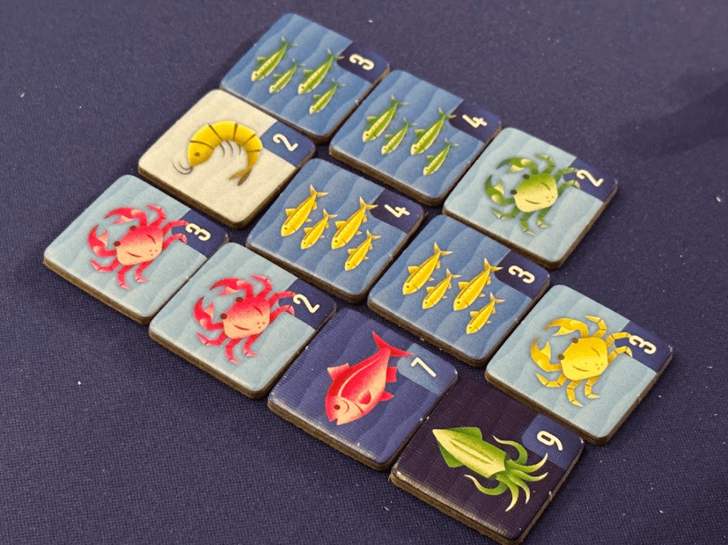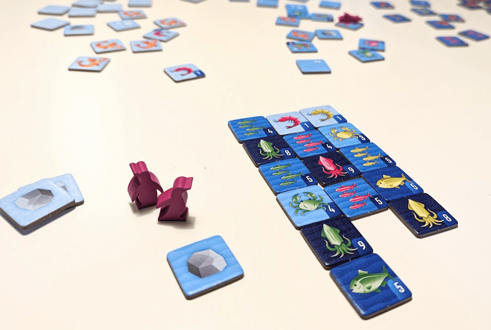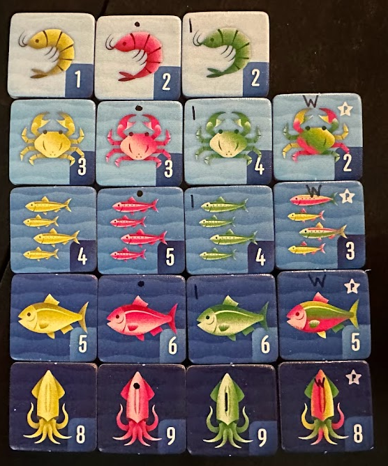 Unfortunately, I just could not distinguish the pink and green tiles from each other in real-world conditions. I had the most trouble with the crab, school of small fish, and squid, though I mixed up all types of tiles at some point. As shown in the image below, this resulted in a mid-game error during solo play, when I placed a green squid in the pink column of my collection.