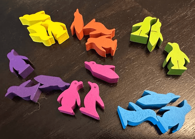Similarly, since purple in this palette was a darker tone than blue, I was able to distinguish those in most lighting conditions. But the pink (they look dark pink to me) and purple penguins looked close to each other on the table. So I added a small dot to each pink penguin (evocative of an eye, matching the game box art) to help.