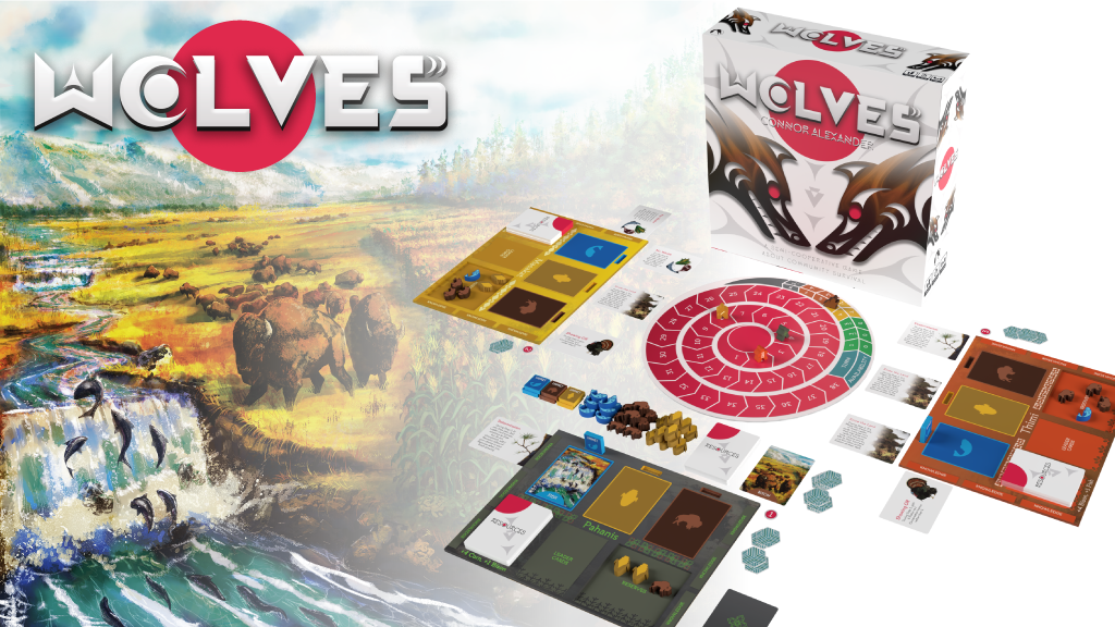 Wolves, designed by Connor Alexander (Cherokee Nation) with art by Sa’dekaronhes Esquivel (Kanyen’kehà:ka/Mexican Indigenous) and Ovila Mailhot (Sto:lo / Nlaka’pamux Nation) is published by Coyote & Crow LLC, a Native owned company that focuses on raising the voices of marginalized creators and presenting Indigenous concepts in tabletop games. Wolves is the next board game in the Coyote & Crow universe.