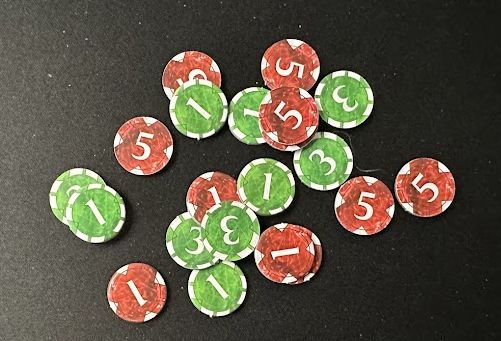 Accessibility Modification: To address this red/green issue, I swapped out the green status tokens with my own glass beads. Since the original status tokens were 1s and 3s, I noticed that I sometimes needed a secondary replacement for high-token cards like Silver Snake. To address this, I grabbed a green die I had lying around to help with larger status numbers: 8 in this example.
