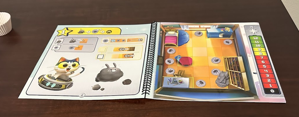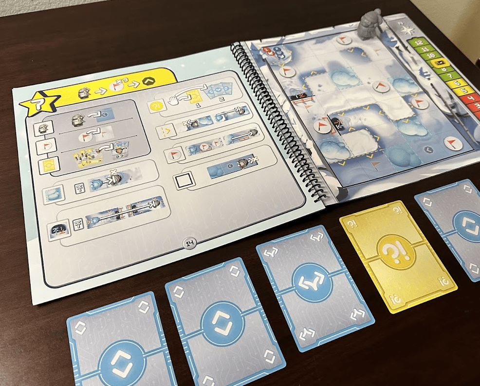 In Quirky Circuits: Penny & Gizmo’s Snow Day!, two to four players work together to complete 10 different programming puzzles, chasing down dust bunnies and collecting flags with one of two robot characters. In this limited-information cooperative game, players use movement cards to program the robots each turn, and turns are limited by their battery life. The spiralbound book of scenarios works very well and is similar to Gloomhaven: Jaws of the Lion and Ravensburger’s recent Adventure Book Games (The Princess Bride, The Lord of the Rings, The Wizard of Oz).