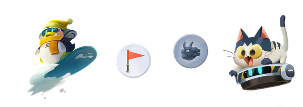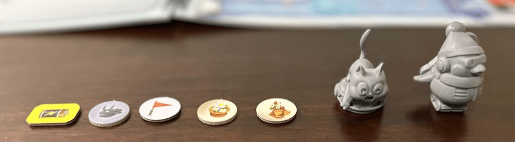 Components. All game components are easy to compare using information other than color. As shown below, each token is distinct from the others, and even items that don’t ever share the same board (flags/dust bunnies, penguin/cat) are easily distinguished.
